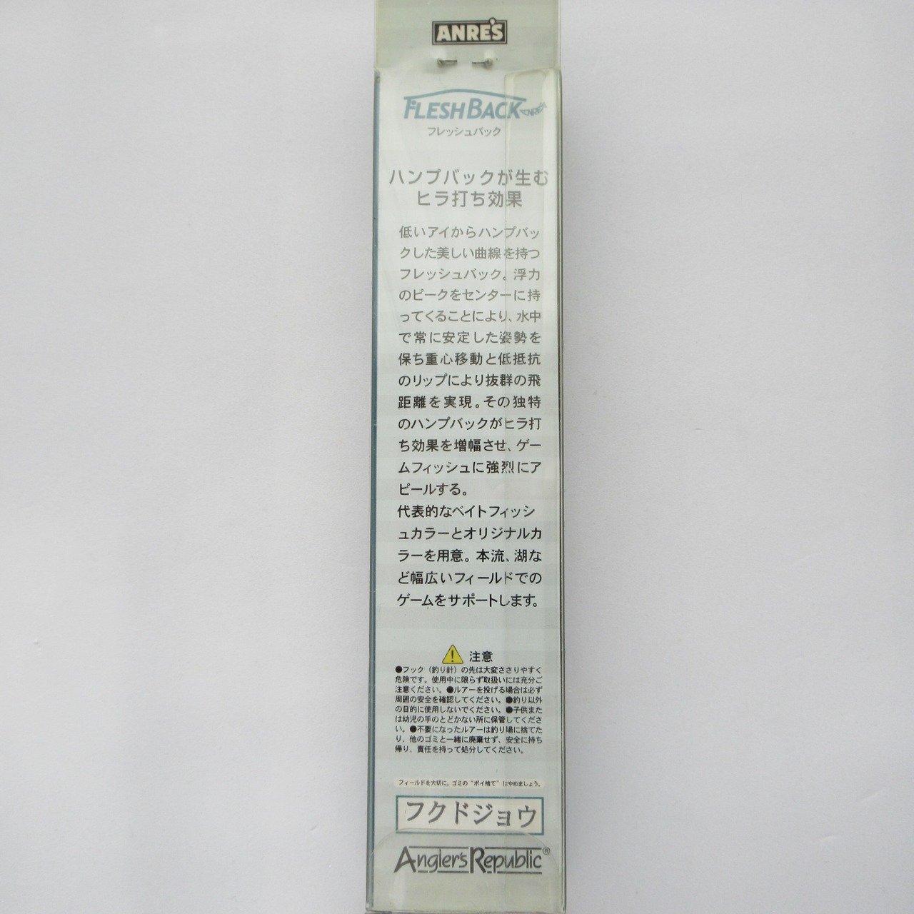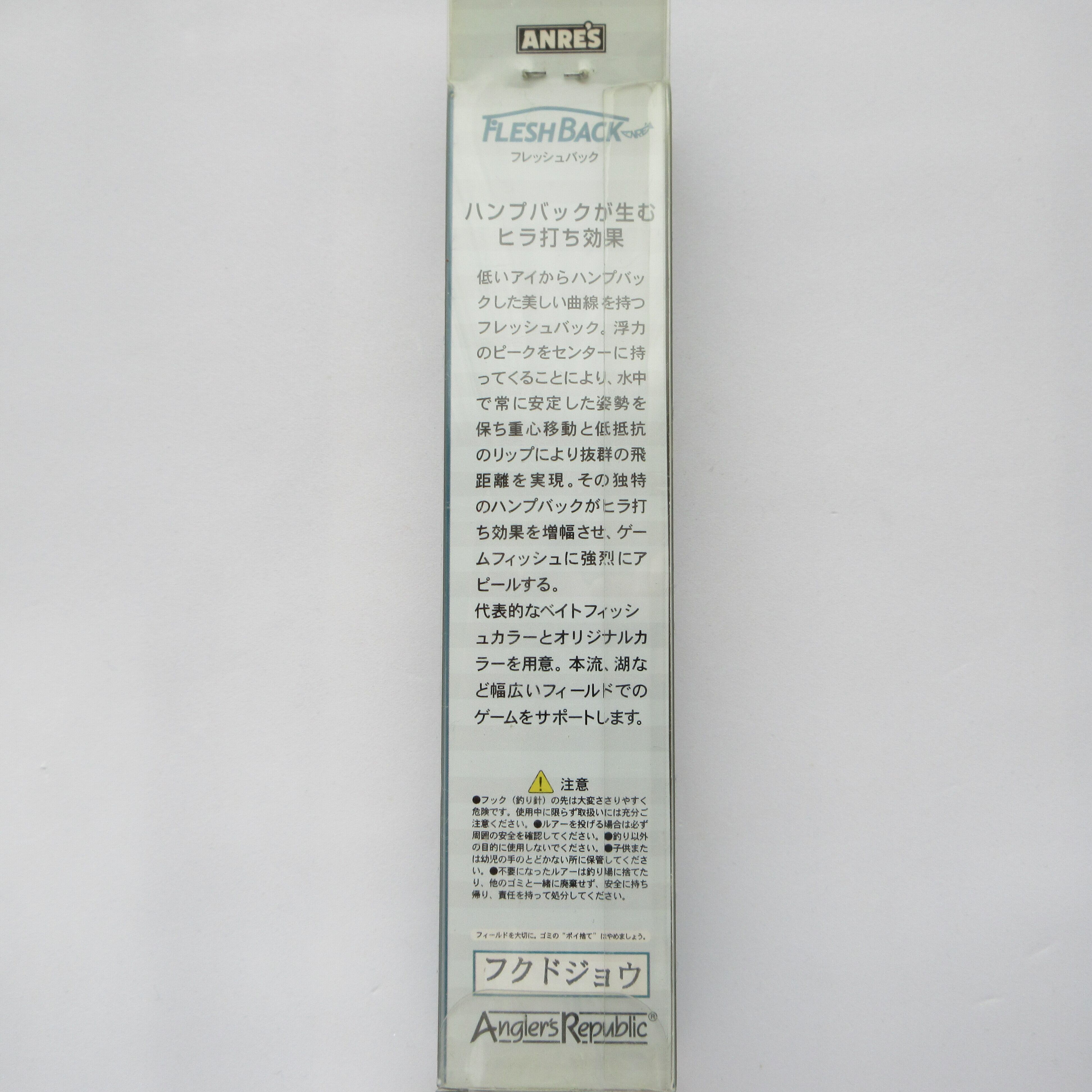 低いアイからハンプバックした美しい曲線を持つフレッシュバック、浮力のピークをセンターに持ってくることにより、水中で常に安定した姿勢を保ち重心移動と低抵抗のリップにより抜群の飛距離を実現。その独特のハンプバックがヒラ打ち効果を増幅させ、ゲームフィッシュに強烈にアピールする。