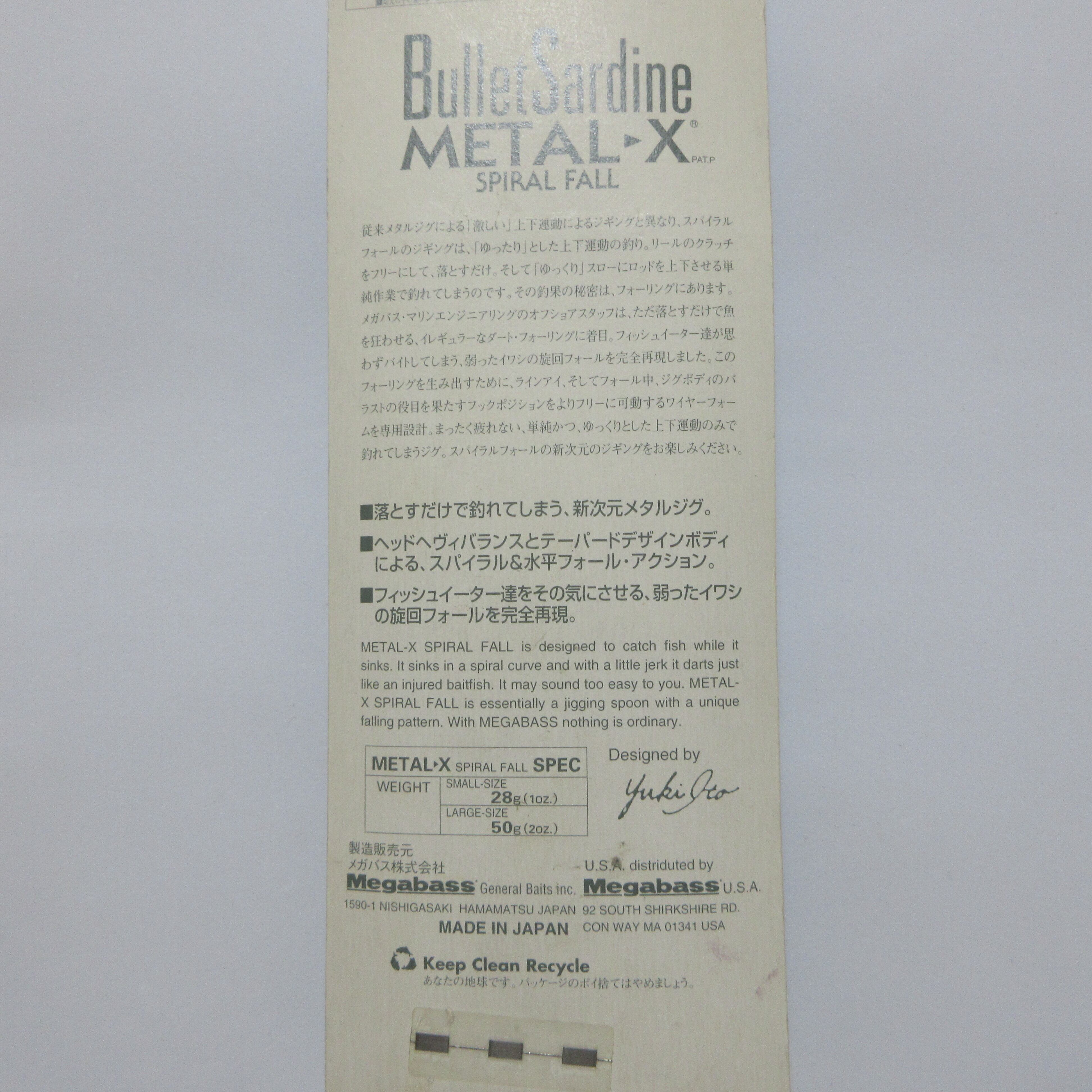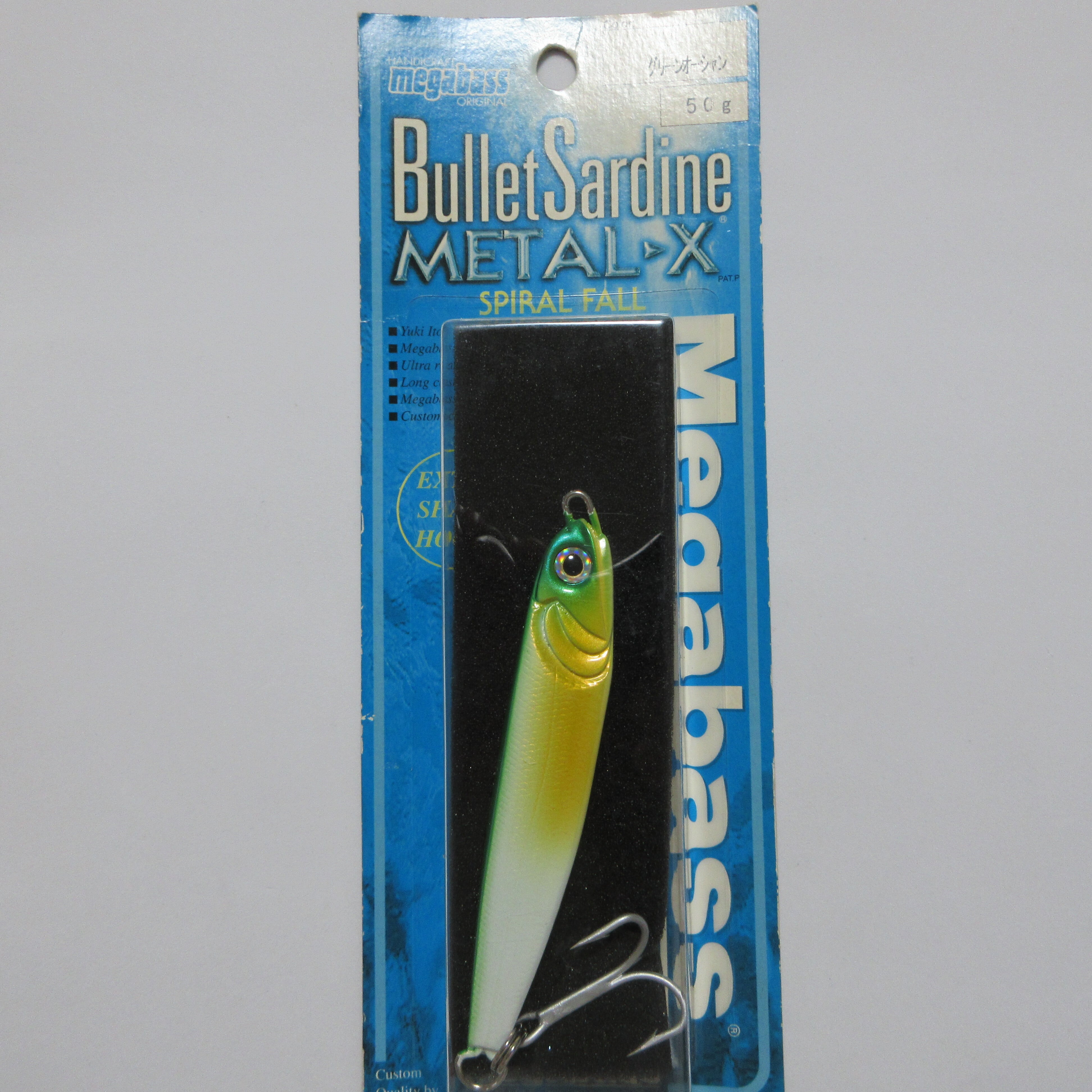 50g OLD メガバス メタルX スパイラル フォール メタルジグ HANDI CRFT megabass Bullet Sardine Metal▶X SPIRAL FALL ORIGINAL MARIN TECHNICA Designed by Yuki Ito シラス シーバス ヒラメ シイラ ブリ カンパチ ロウニンアジ(GT) オオニベ ヴィンテージ オールド レア 希少 ルアー